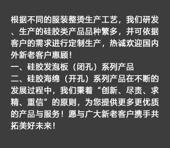 我公司生產的硅膠海綿(開孔)系列產品具有耐高溫、透氣性好、耐壓性強等優(yōu)點,是西服及高檔服裝整燙生產的必備產品。硅膠發(fā)泡板(閉孔)系列產品具有發(fā)泡均勻,耐高溫、耐壓性能好,其中新研制開發(fā)的針孔浮點硅膠發(fā)泡板攻克了一般產品的浮點不飽滿的技術難題,一般產品的浮點不飽滿,容易擋住透氣孔,造成吸風效果不良。我司的產品具有更好的透氣性和回彈性,以及更長時間的試用壽命。